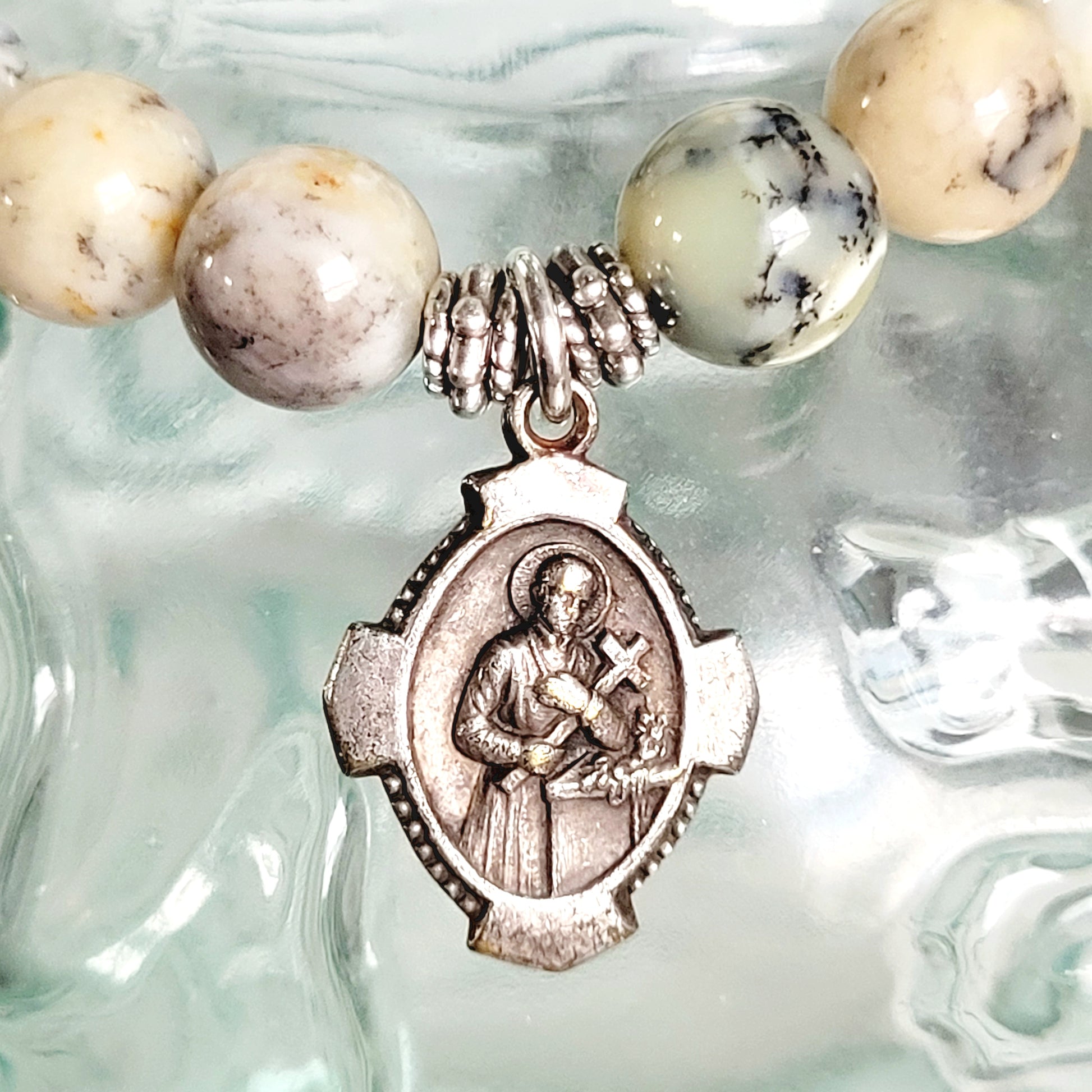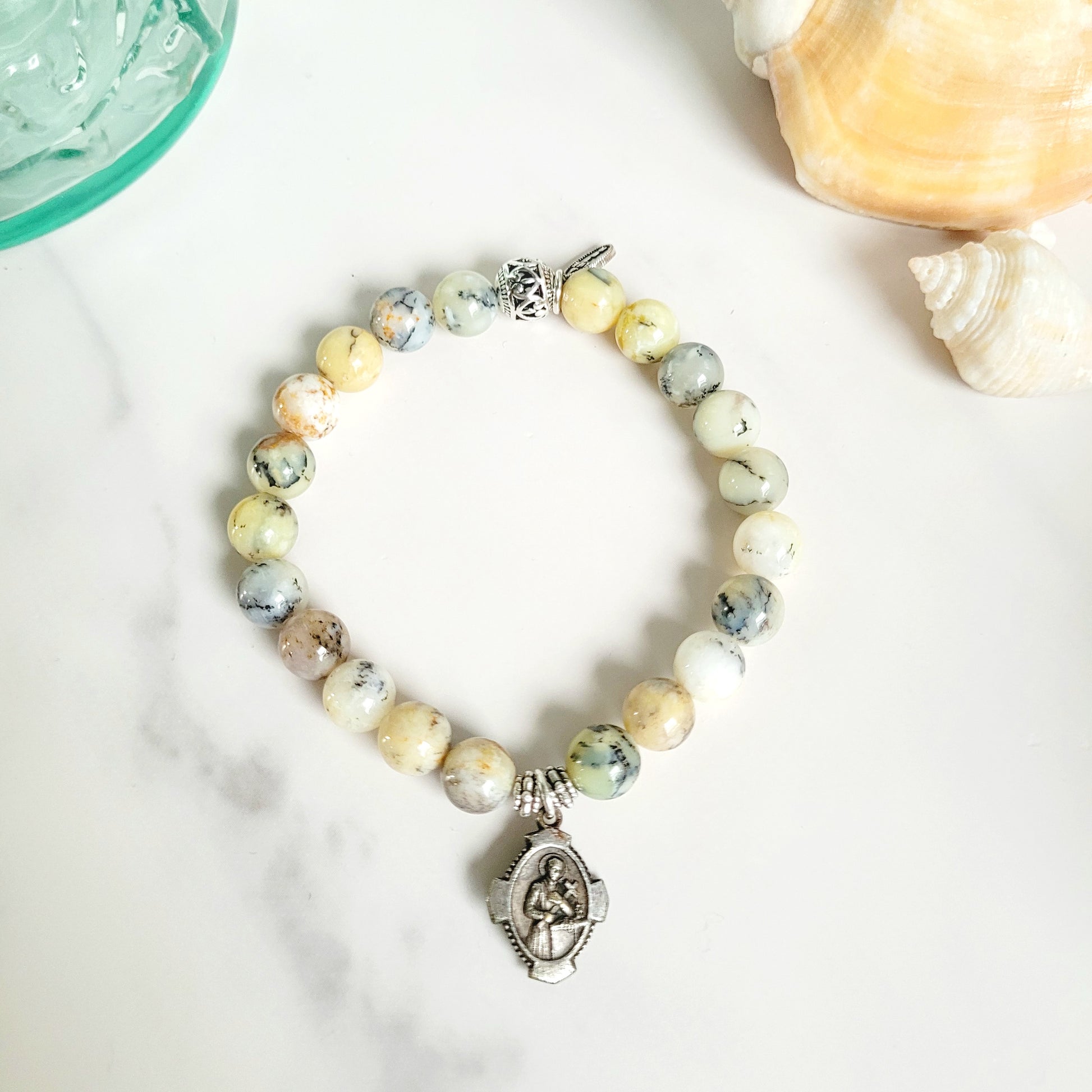 African Opal 10mm Beaded Bracelet w/ Vintage Silver Plated Medal of St. Gerard Majella