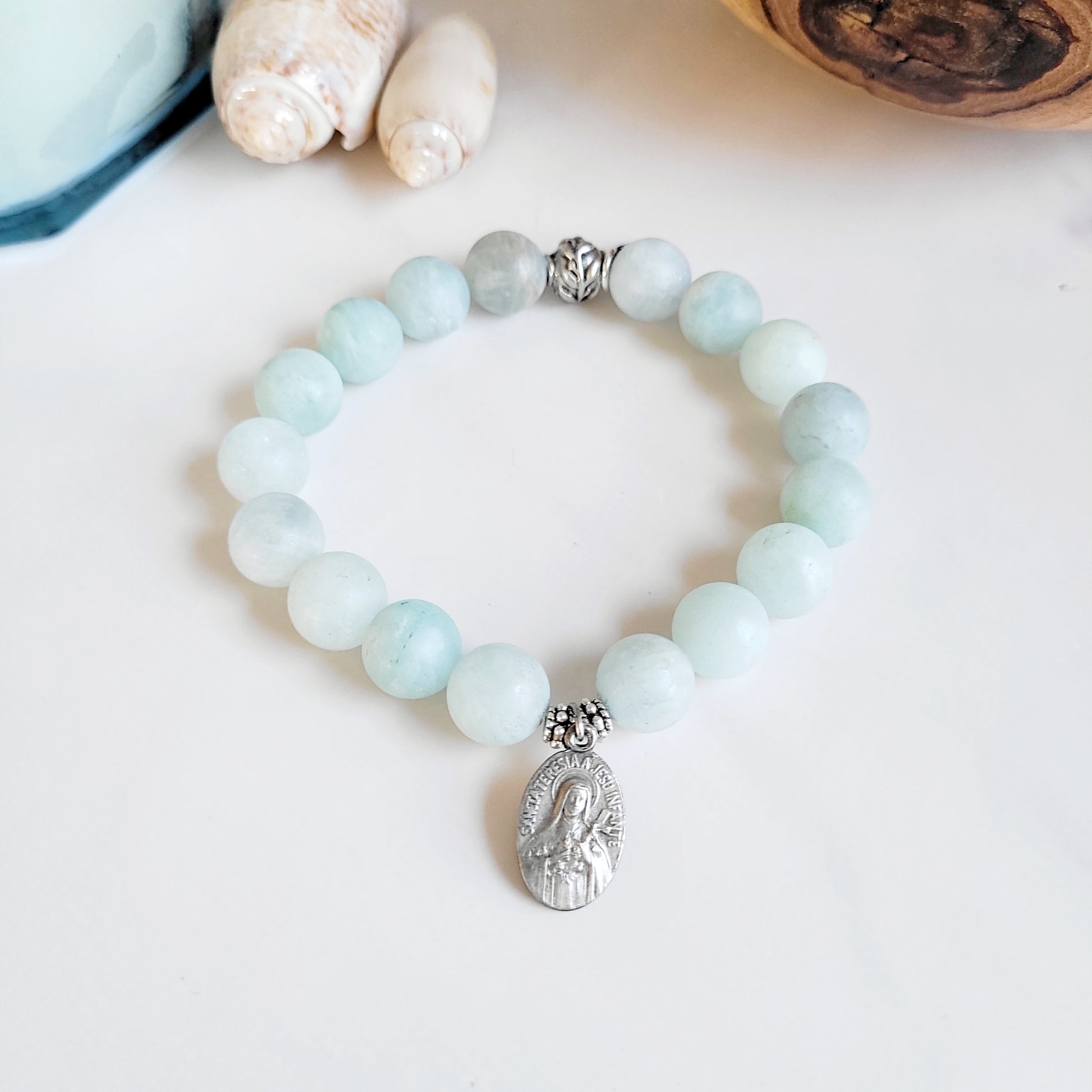 Aquamarine Matte 10mm Beaded Bracelet w/ St. Therese of Lisieux Vintage Silver Plated Medal