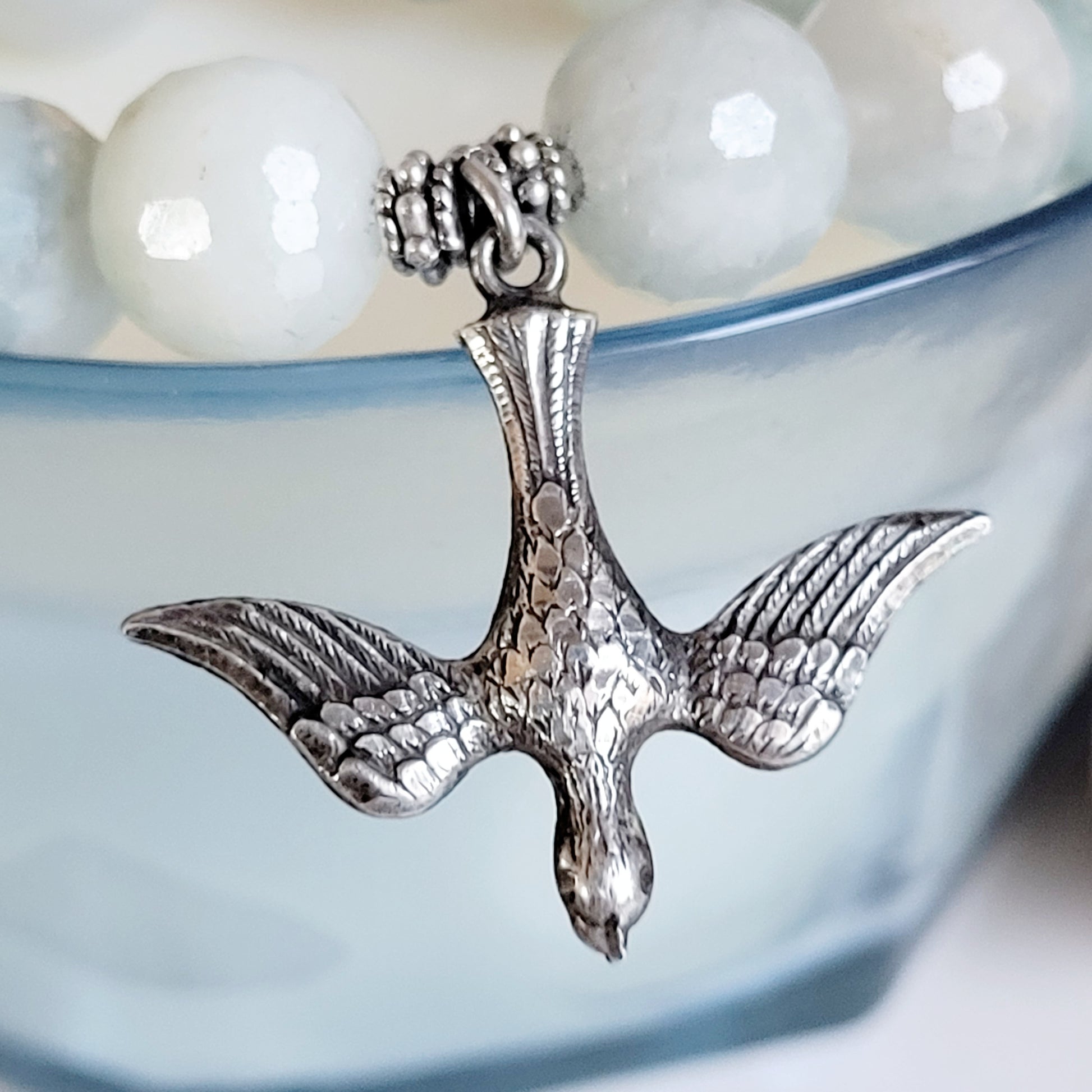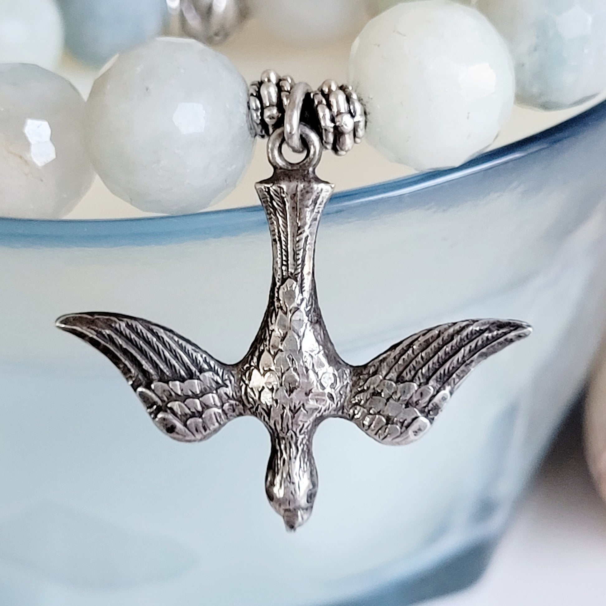 Aquamarine Natural Faceted 12mm Beaded Bracelet w/ Sterling Silver Dove
