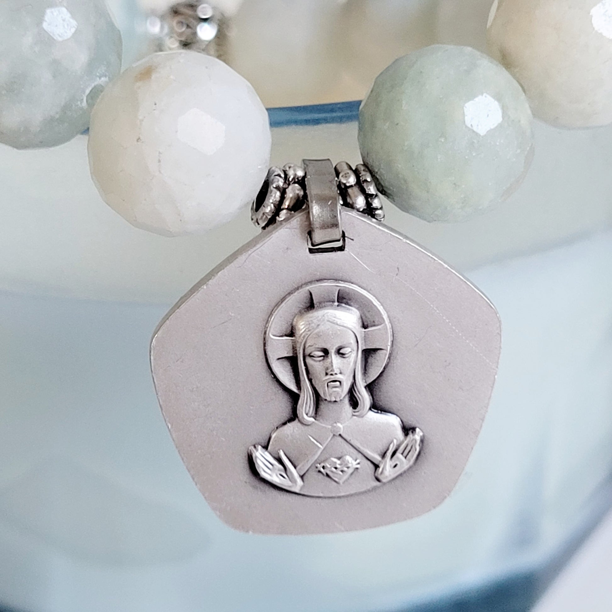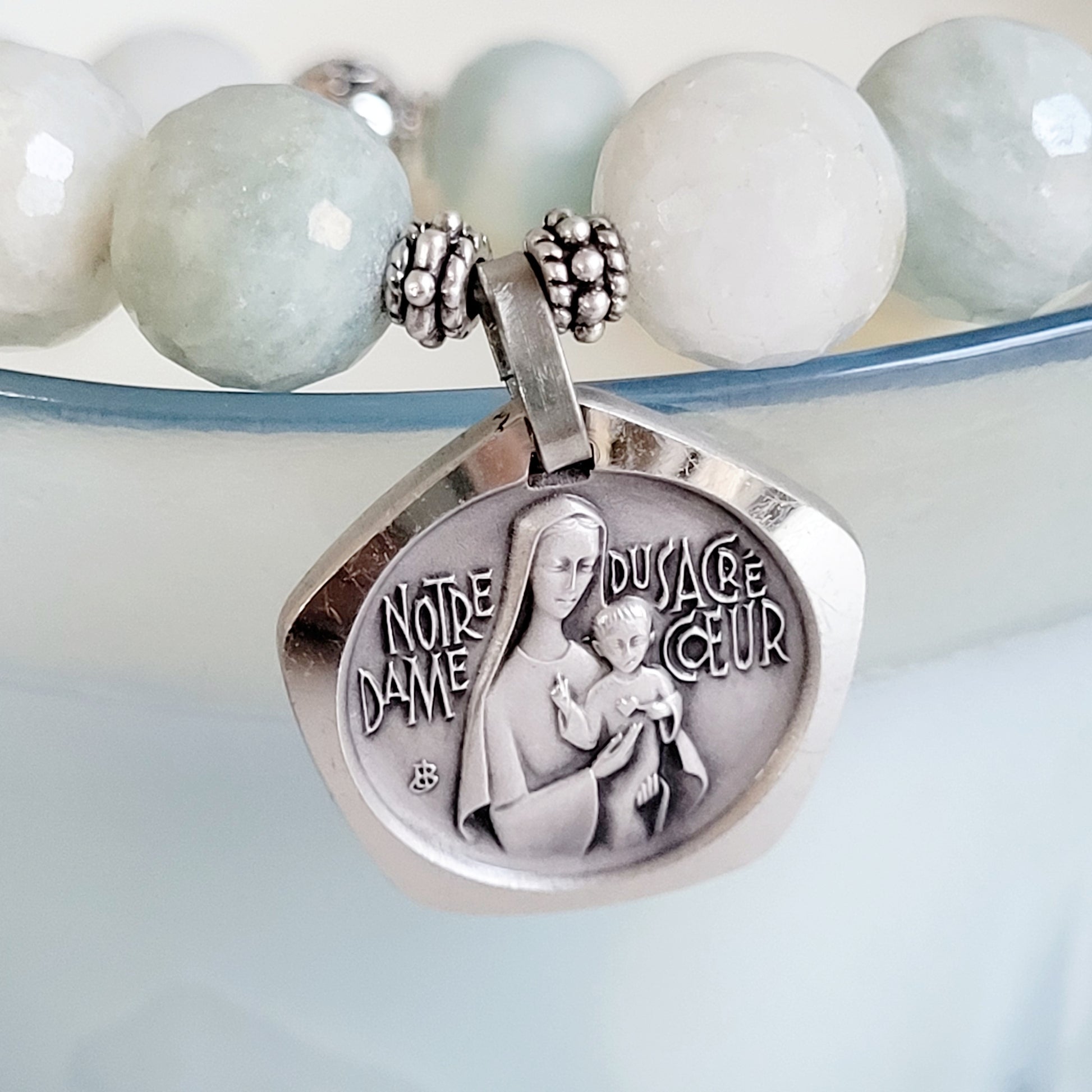 Aquamarine Natural Faceted 12mm Beaded Bracelet w/ The Sacred Heart of Jesus / Our Lady of the Sacred Heart Signed Sterling Silver Medal