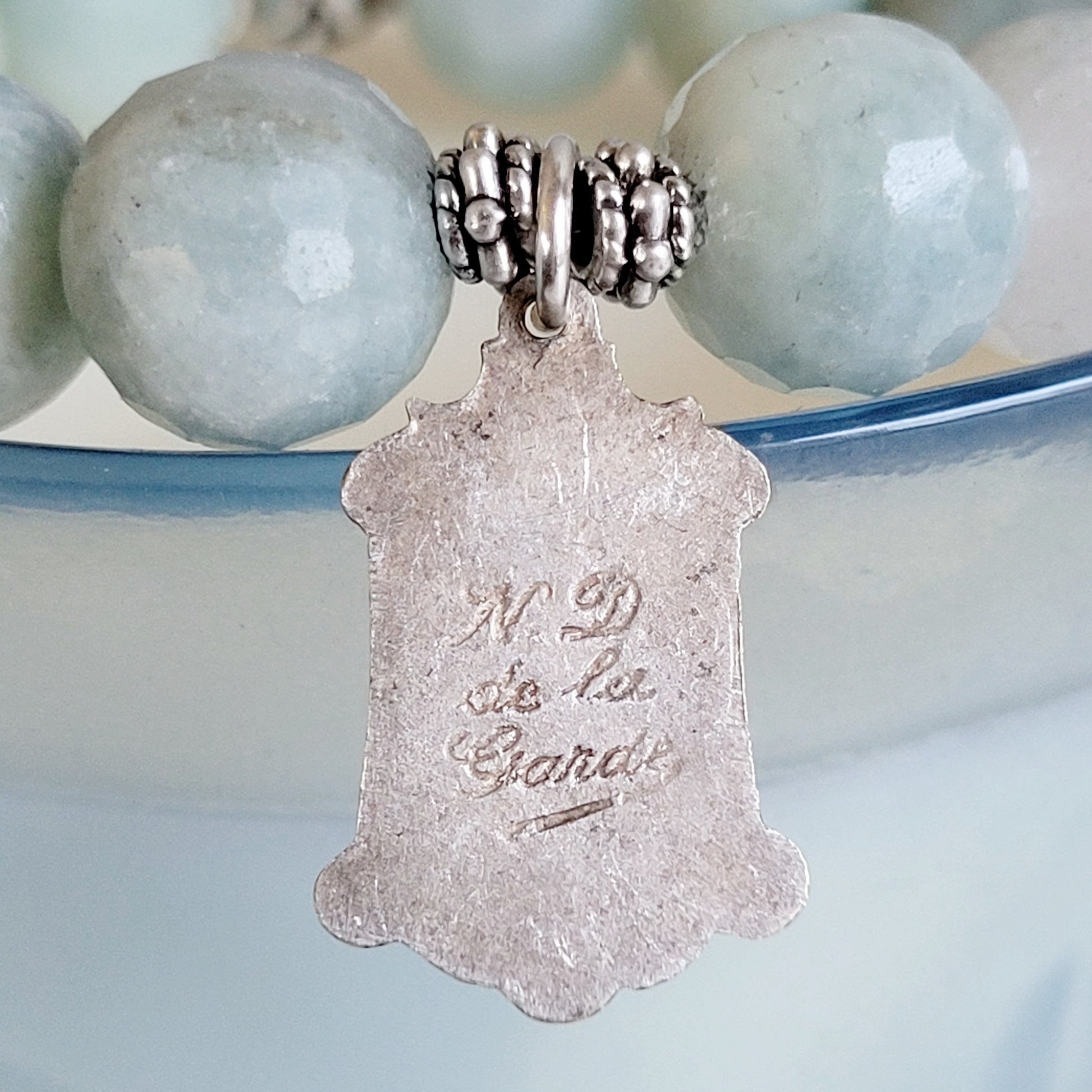 Aquamarine Natural Faceted 12mm Beaded Bracelet w/ Our Lady of the Guard / Notre Dame de la GardeSilver Plated Metal