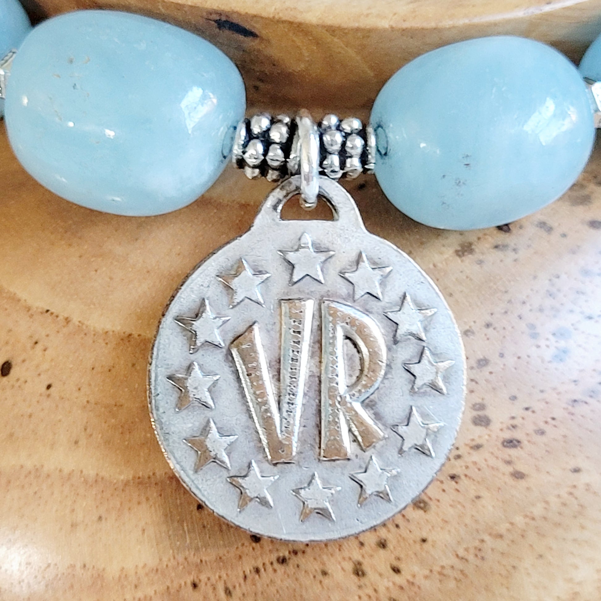 Aquamarine Pebble Smooth 12mm Beaded Bracelet w/ Our Lady of Beauraing Silver Plated Medal