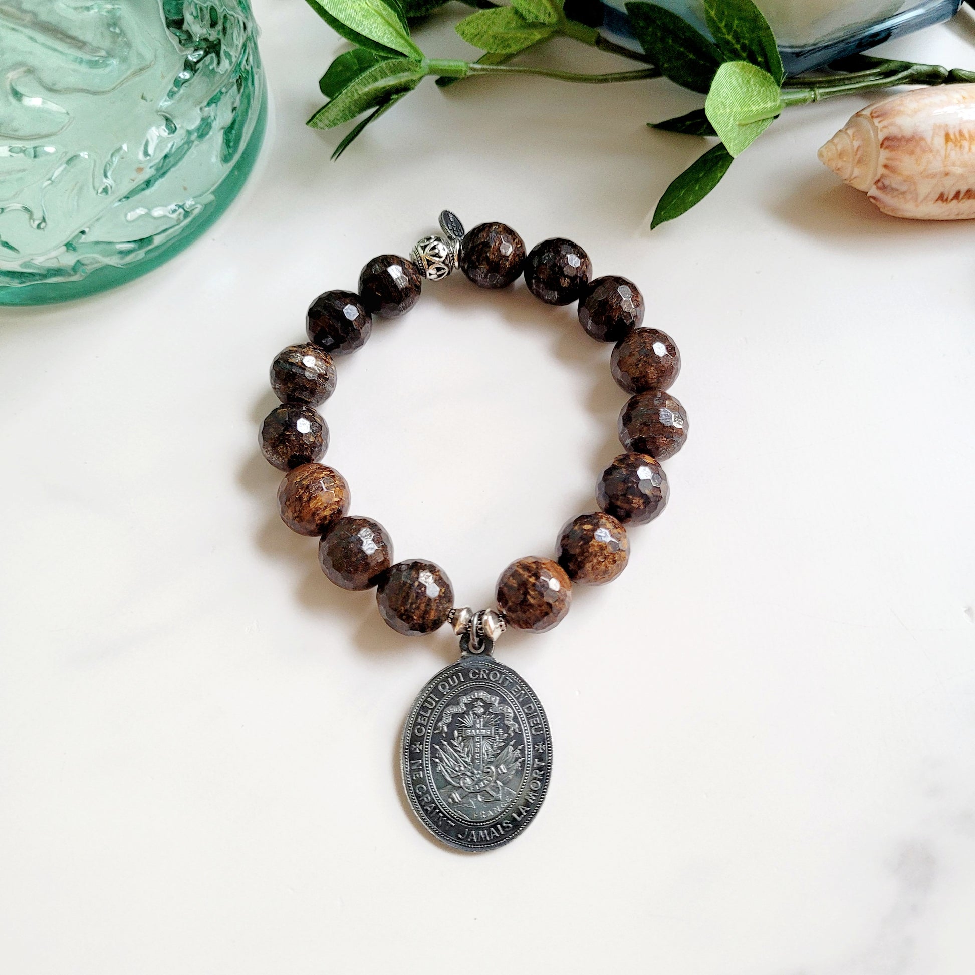 Bronzite Faceted 12mm Beaded Bracelet w/ Large Silver St. Benedict Medal from France