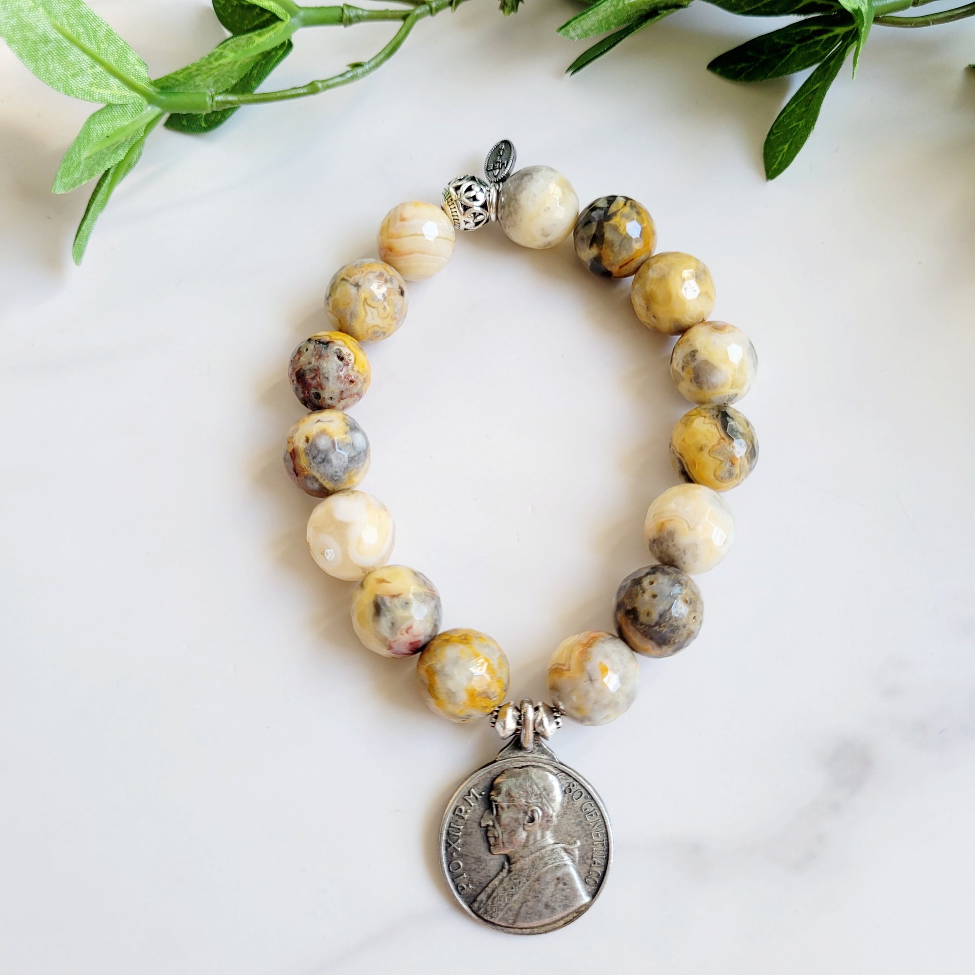 Crazy Lace Agate Faceted 12mm Beaded Bracelet features a beautiful large medal of a beloved pope Pope Pius XII, who served the Church from 1939 to 1958. The letters PM next to his name on the medal stand for Pontifex Maximus, a title that dates back to ancient Rome. Translated it means "greatest pontiff" or "supreme bridge builder".
