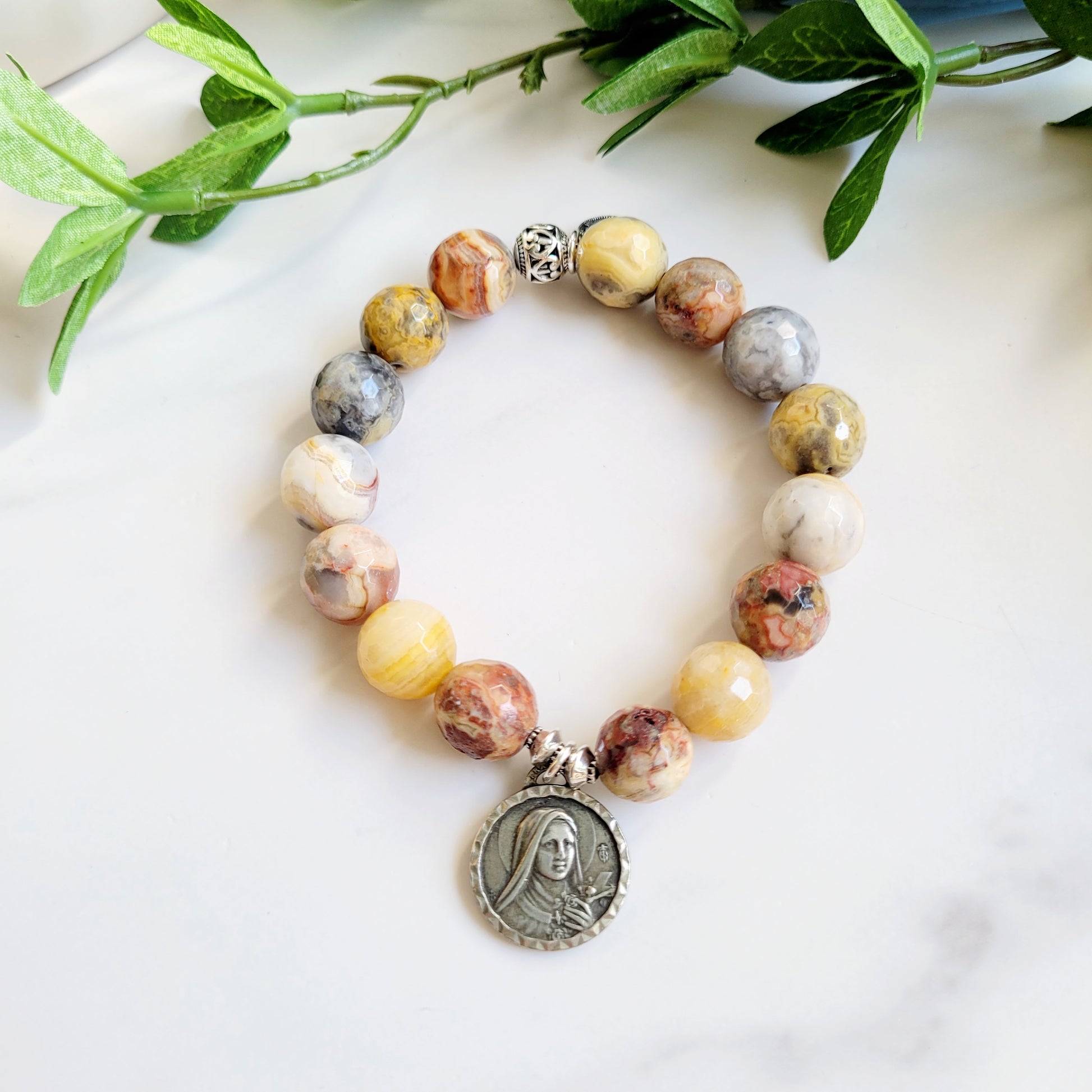 Crazy Lace Agate Faceted 12mm Beaded Bracelet features a beautiful heavily embossed medal of a favorite saint, St. Therese of Lisieux. She is know as the Little Flower, and also, of the Child Jesus. On the back is the Basilica dedicated to her in Lisieux, France, which is the second most popular pilgrimage site in France after Lourdes. Her feast day is October 1 and she is the patron saint of missions, France, Russian Catholics and those suffering from terminal illness or tuberculosis.