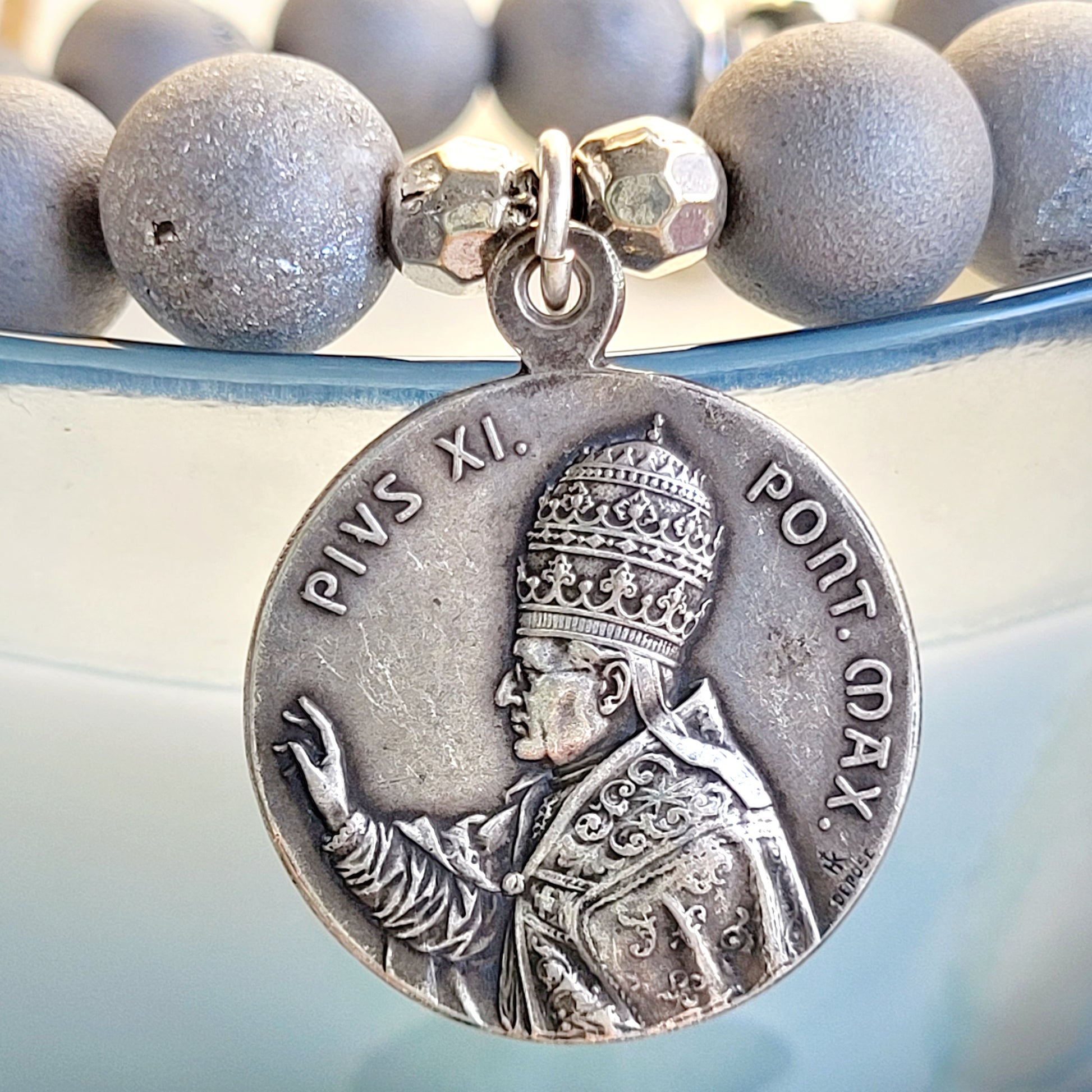 Druzy Agate Gray 10mm Beaded Bracelet w/ Vintage Deeply Embossed Silver Plated Medal of The Canadian Martyrs