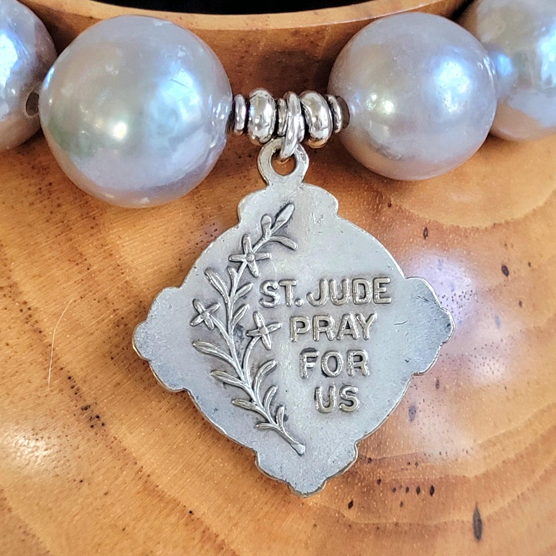 Freshwater Pearls Grey 14mm Beaded Bracelet w/ Diamond Shape Silver Plated Medal of St. Jude Thaddeus