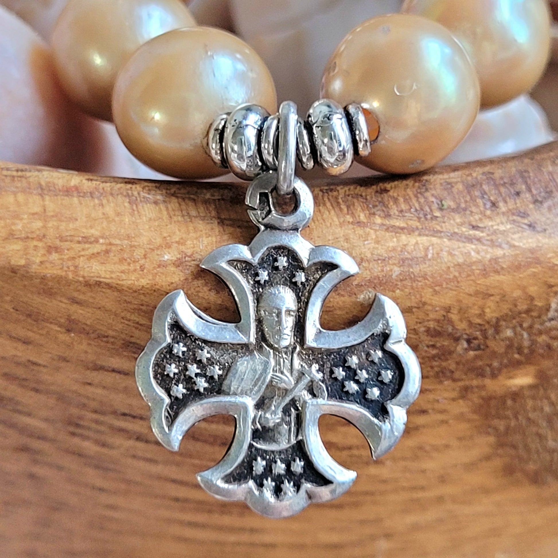 Gold Freshwater Pearl 10mm Beaded Bracelet w/ a lovely sterling silver French cross of Saint John Francis Regis who was a Jesuit priest and a tireless preacher. He was best known for his work with at-risk women and orphans and established safe houses for them. His Feast Day is June 16 and he is the patron saint of lace workers, Regis University, Regis High Schools across the country.
