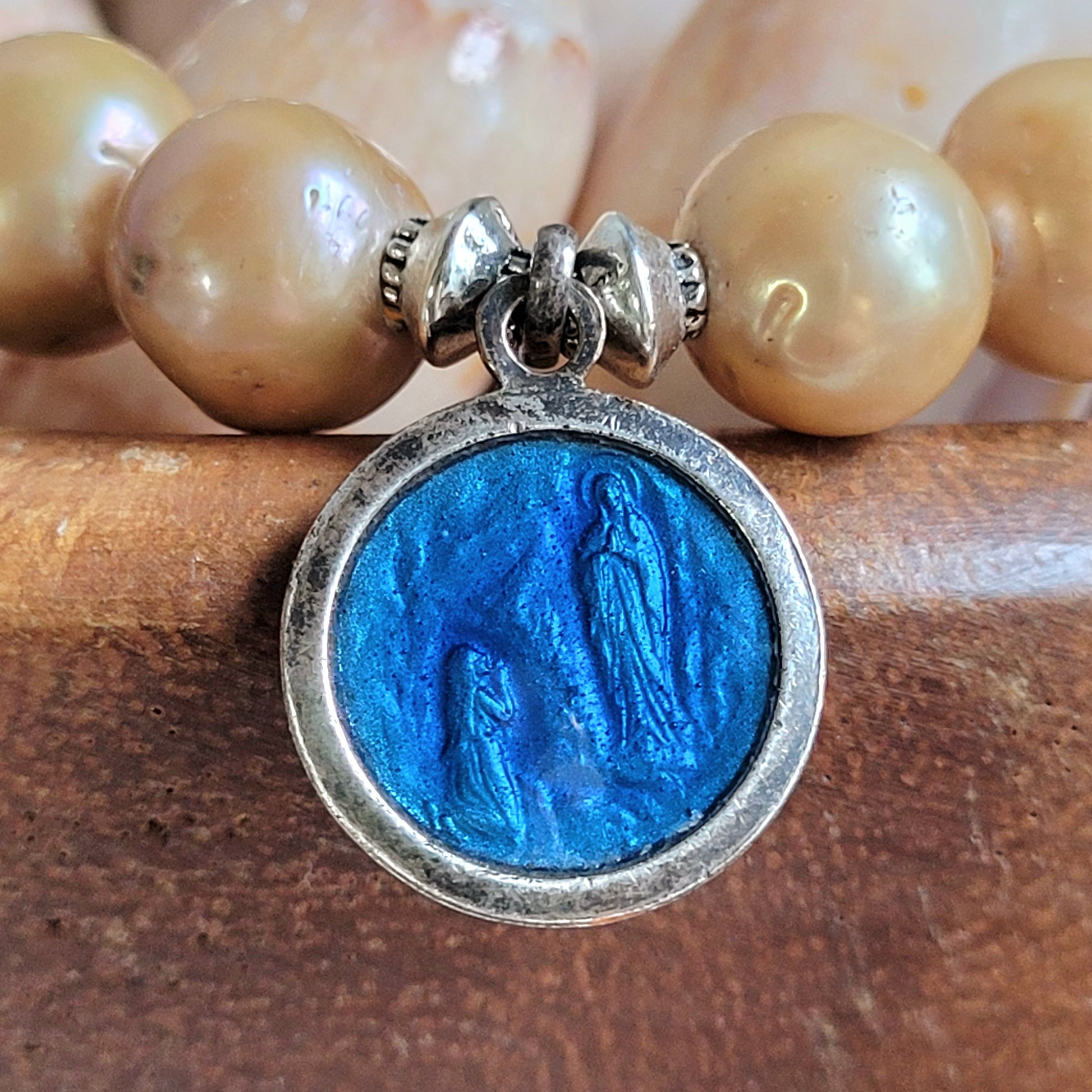 Gold Freshwater Pearl 10mm Beaded Bracelet w/ Vintage Sterling Silver Blue Enameled Medal of Our Lady of Lourdes