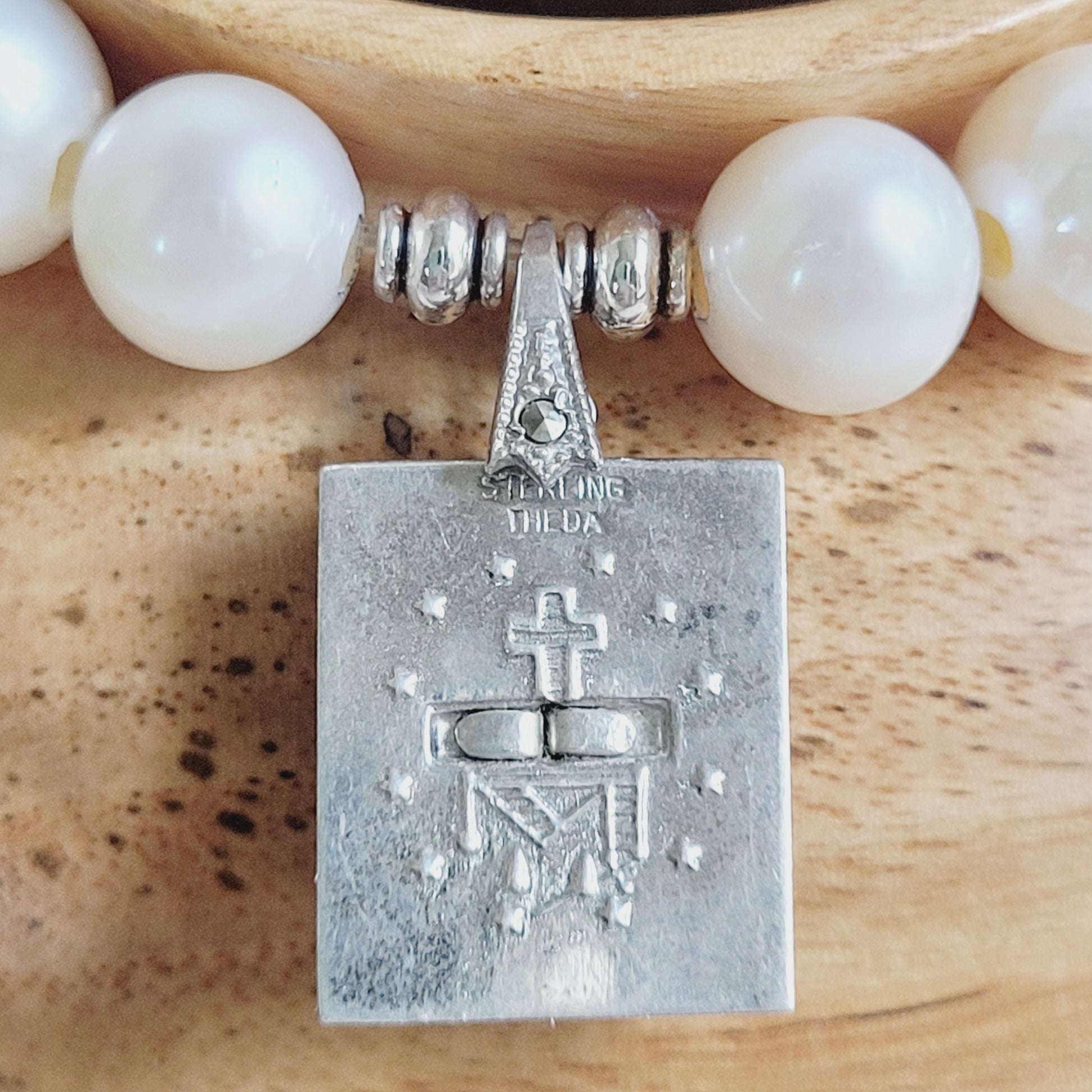 White Freshwater Pearl 10mm Beaded Bracelet w/ Miraculous Mary Marcasite Sterling Silver Medal